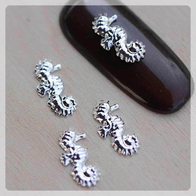 Körömdekoráció tengeri csikó formában fényes ezüst színben. Fém díszítő forma mely kiválóan illik a nyár hangulatához. Glue gél segítségével könnyen és tartósan a körömre rögzíthető. Kiválóan kombinálható strasszköveinkkel és különleges körömdíszeinkkel.