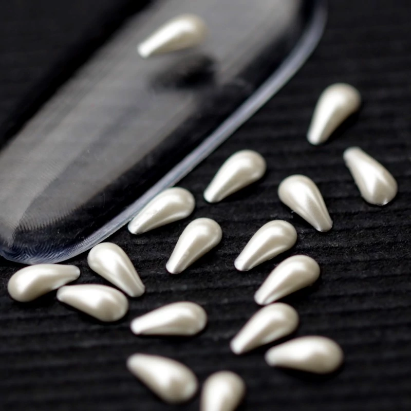 Félgyöngy körömdísz szabályosan vágott, szép koreai minőségben, hófehér színben, mini cseppformában. Virágszirmokhoz kiváló. Kreatívan kombinálható egyedi félgyöngy formáinkkal.