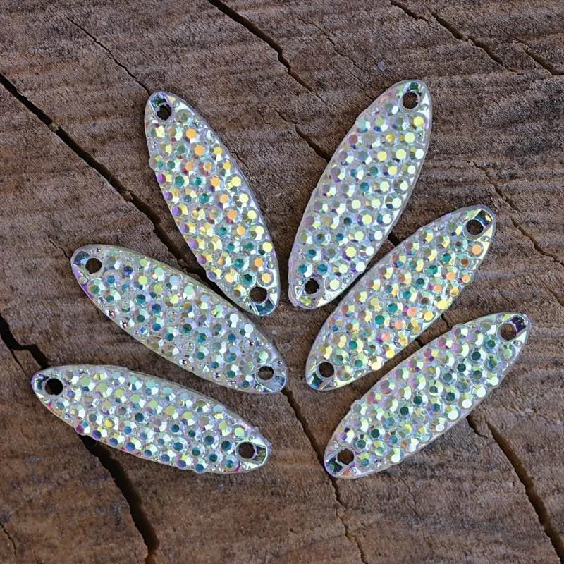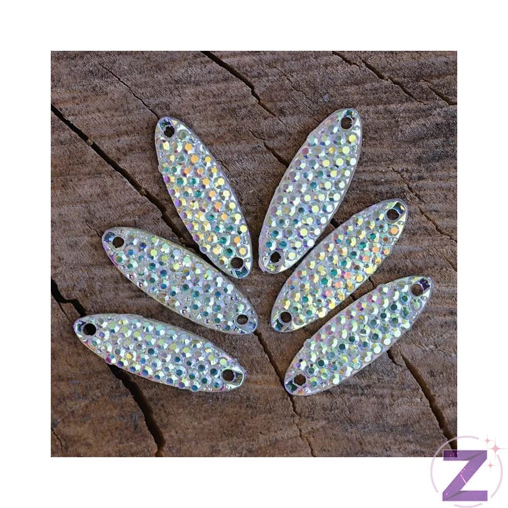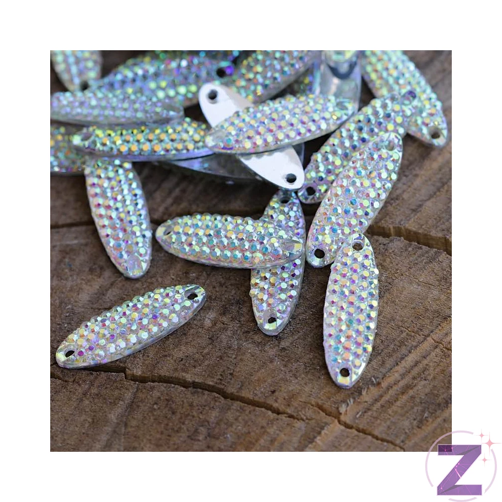 Varrható ruhadísz hosszú ovális formában, kövezett felülettel, színjátszó színben. Fitness bikinik, fellépő és táncruhák tökéletes díszítője, kombinálható különleges varrható díszeinkkel.