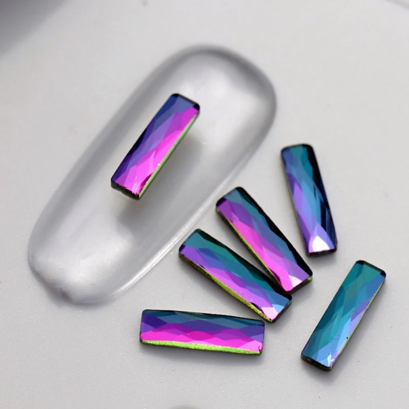 Strassz formakő hasáb vitrail medium színben. Más betekintési szögből más színt mutat. Glue géllel vagy zselével ragasztható. A köröm közepére felhelyezve tökéletesen illeszkedik, nem akad. Szimmetrikus formája miatt könnyedén körberakható például szórógyöngyökkel, szegecsekkel vagy éppen strasszkövekkel.